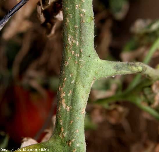 - des petites lésions de quelques millimètres de diamètre, d'abord blanchâtres et devenant rapidement chancreuses, apparaissent sur les organes aériens de la tomate. Ces petits chancres superficiels, qui se nécrosent lentement, sont plutôt rares sur les Folioles, plus fréquents sur la tige (figure 7), les pétioles et les fruits (figure 8). Sur ces derniers, ils ont souvent une apparence particulière : des petites taches circulaires blanches et plates en périphérie et dont le centre est plus en relief, parfois éclaté, de couleur beige à ocre. Ces caractéristiques leur confèrent l'apparence d'un oeil d'oiseau (bird's eye spot, figure 8). Par ailleurs, l'émission de racines adventives peut avoir lieu sur la tige.