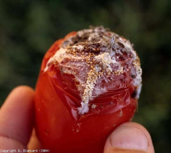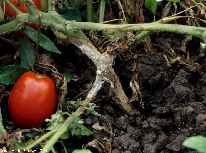 Athelia rolfsii ( Sclerotium rolfsii ) attacca tutti gli organi del pomodoro situati all'interno o in prossimità del suolo , sia che le piante siano molto giovani (nei vivai) che adulte.