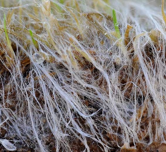 Le prime contaminazioni avvengono attraverso il micelio già presente nel terreno (Figure 4 e 5) o dagli sclerozi. Sono spesso localizzati sulle parti di piante poste a livello della superficie del suolo, vicino oa contatto con quest'ultimo. A. rolfsii , quando si trova in prossimità di un potenziale ospite, produce enzimi litici come le poligalatturonasi e l' acido ossalico , un veleno che provoca la morte cellulare . Può quindi penetrare direttamente nei tessuti e invaderli dopo averli decomposti grazie all'azione combinata dei composti precedenti. La sua evoluzione inter ed intracellulare è molto rapida, soprattutto se le condizioni climatiche gli sono favorevoli. Questo processo parassitario , che dura dai 2 ai 10 giorni a seconda delle condizioni climatiche, è all'origine dei deterioramenti umidi e dei marciumi osservati sui vari organi. Sul tessuto danneggiato, forma rapidamente micelio e sclerozi. Questi possono germogliare rapidamente perché non hanno bisogno di una fase dormiente. Sono comunque in grado di mantenersi per diversi anni nel terreno senza germinare.