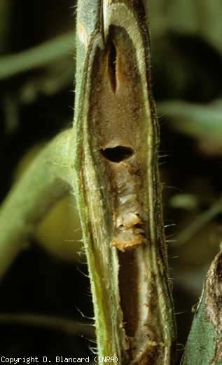 Pseudomonas corrugata est une bactérie, comme le nom de la maladie le suggère (moelle noire, tomato pith necrosis), qui affecte également la moelle de la tige de la tomate. Celle-ci prend, dans un premier temps, une apparence translucide et une teinte brun pâle (figure 1), puis noircit progressivement . Elle peut également s'évider et se rétracter pour former plusieurs cavités qui alternent plus ou moins régulièrement avec des parties encore intactes ((figure 2). On parle, dans ce cas, de moelle « en pile d'assiettes ». Les tissus vasculaires peuvent présenter une coloration brunâtre (figures 3 et 4). En outre, l'apex est souvent bloqué et les jeunes feuilles chlorotiques  Des lésions allongées, de formes irrégulières et de couleur brune à noire sont visibles à la surface de la tige (figure 5) et parfois des pétioles. Une prolifération de racines adventives aériennes peut également se manifester (consulter les Autres altérations et anomalies sur tige).