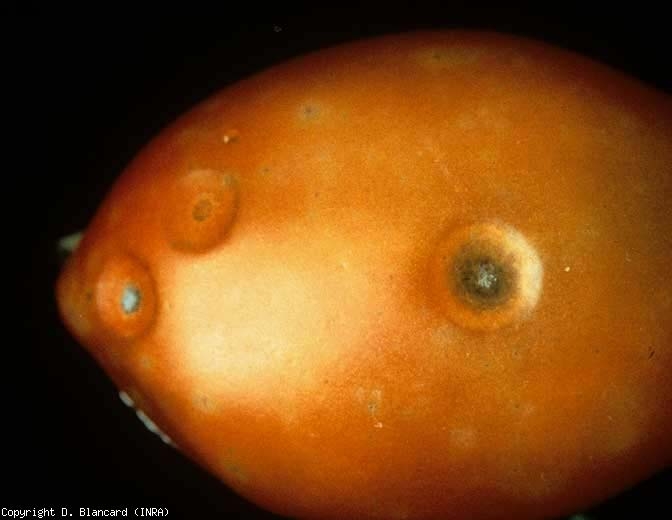 Les premiers symptômes apparaissent plutôt sur des fruits mûrs sous la forme de petites lésions brun clair qui évoluent en taches circulaires, légèrement déprimées et humides, réparties au hasard (figure 1). Ces lésions s'étendent, se creusent progressivement et s'assombrissent. La chair sous-jacente prend une teinte plus claire et une texture granuleuse (figure 2). Le centre des lésions évoluées prend une teinte brunâtre et des ponctuations noires apparaissent, qui correspondent aux microsclérotes produits par ces champignons (figure 3). La cuticule des fruits reste intacte ; elle peut se couvrir de petites masses de spores muqueuses, couleur saumon, en conditions climatiques humides. Signalons que plusieurs taches présentes sur les fruits peuvent confluer et entraîner une large pourriture.