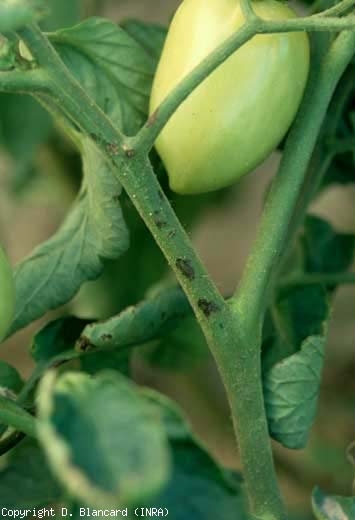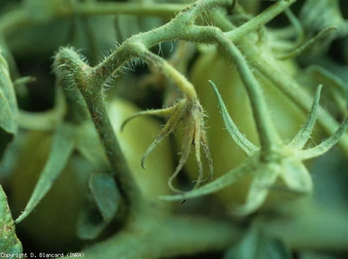 Lesioni dall'aspetto simile sono visibili su altri organi, in particolare sui sullo piccioli , stelo (Figura 3) e sui peduncoli . Sono spesso più estese e allungate rispetto alle foglioline. Quando presenti sui dei pedicelli fiori e sui sepali , possono dar luogo alla caduta di molti fiori (Figura 4).