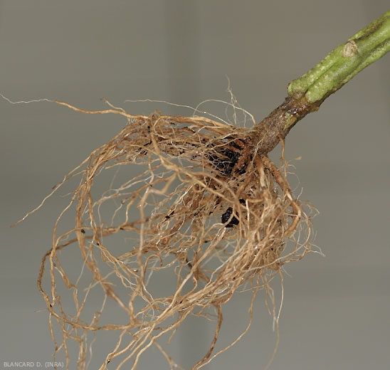 Indipendentemente dalla gravità dell'avvizzimento, i sintomi primari dovrebbero essere trovati sulle radici e sulle corone delle piante. Sul primo, sia la corteccia che il cilindro, rivelano numerose lesioni bruno-rossastre che umide si rapidamente in trasformano marciume (figure da 1 a 3). Più piccolo è il diametro delle radici, più velocemente marciscono e si decompongono. Ciò è particolarmente vero in alcuni substrati di colture fuori suolo in cui sono molto abbondanti.