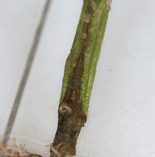 Un chancre si sviluppa frequentemente sul collo . Inizialmente diventa marrone scuro e il tessuto malato è più o meno depresso (Figura 4). Questo ciclo evolve spesso longitudinalmente, su un lato del gambo, assumendo la forma di una fiamma che può estendersi fino a più di 30 cm sopra il collo (figure 5 e 6). La parte centrale del chancre assume una tinta salmone rosata e un aspetto piuttosto mucoso, dovuto alla formazione di sporodochia del fungo (figura 7).