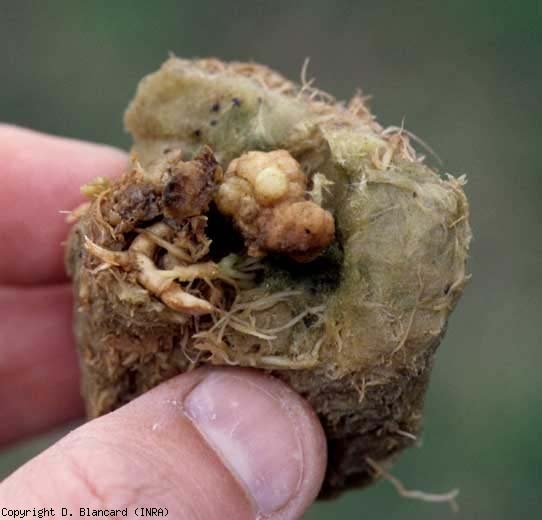 - au niveau du collet de pieds de tomate cultivées en hors-sol sur laine de roche. Dans ce cas, des tumeurs plus ou moins grosses étaient visibles au pied de quelques plantes (figures 2 et 3).