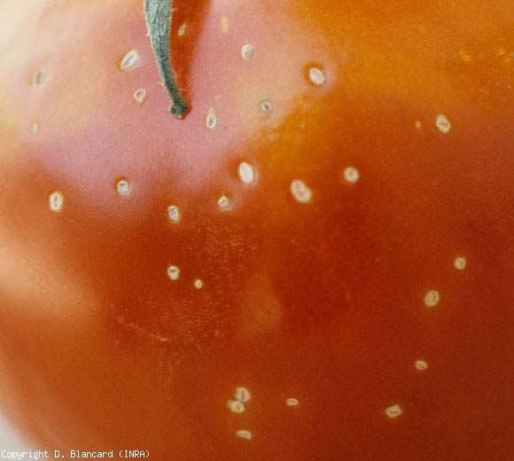 Piccole lesioni biancastre, da leggermente allungate a ovali, che compaiono in numero maggiore o minore sull'epidermide nella zona del picciolo dei frutti di pomodoro ( frutto vaiolo del , vaiolo del pomodoro ). Questi cambiamenti si diffondono leggermente e diventano necrotici; l'epidermide finisce per spaccarsi superficialmente (Figure 1 e 2).