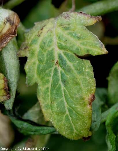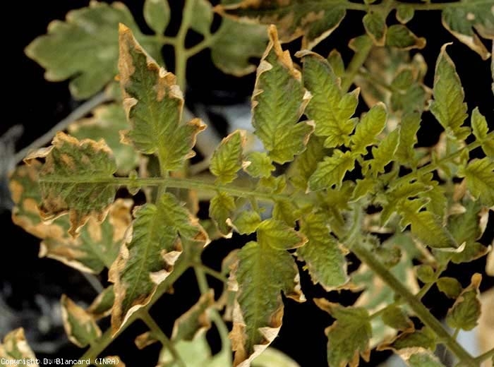 l' appassimento di essiccazione , e la necrosi foglia . Pertanto, i volantini delle piante di pomodoro colpite possono presentare:- chiazze internervali livide sulle foglie inferiori, che si estendono, necrotizzano e si disseccano gradualmente;- necrosi e disseccamento della periferia del lembo di foglie giovani e vecchie;- appassimento e disseccamento delle foglie dell'apice .