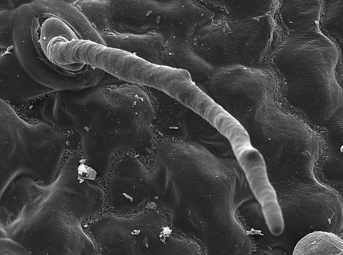 - Gli sporangiofori (figure da 7 a 12), emergenti attraverso gli stomi, sono arbusti ramificati perpendicolarmente e lunghi diverse centinaia di micron. Le loro estremità terminano con sterigmi appuntiti (figura 12) che portano sporangi ialini (figure 13 e 14), da ovoidali a piriformi, di 10-16 x 15-25 µm. Tra 3 e 8 zoospore (6-8 x 4-5µm) (figure 6 e 15), paragonabili a quelle che si formano nelle oospore, compaiono a maturità all'interno di questi sporangi.