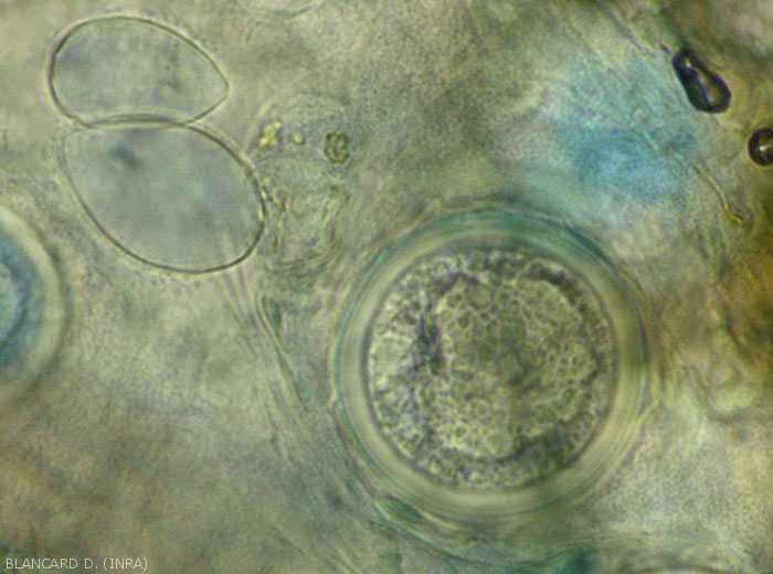- Le oospore (figure da 2 a 4) materializzano la sua forma sessuale (teleomorfa) e ne assicurano la conservazione invernale nei tessuti fogliari. Di colore giallo, misurano tra 25 e 40 µm di diametro. Germinano in primavera e danno origine a macroconidi (figura 3) che si formano all'estremità di un filamento miceliale. Piuttosto piriforme, questo macroconidi misura 23-27 x 30-41 µm e produce diverse dozzine zoospore da di piriforme a ovoidale (figura 4), che misurano 4-5 x 6-10 µm, e mobili grazie a due flagelli.