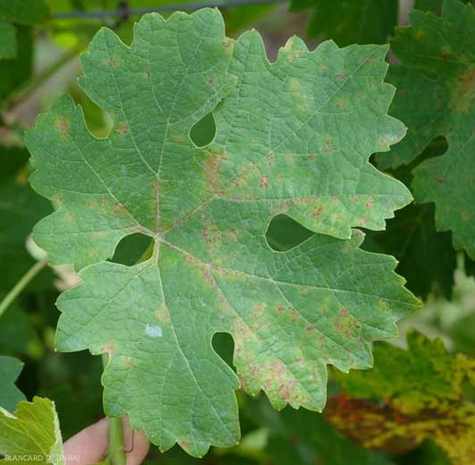 - macchie più o meno circolari ed estese, dapprima traslucide a oleose, ingiallite abbastanza rapidamente, poi necrotizzanti (soprattutto sulle foglie giovani) (figure da 1 a 3). Sul lato inferiore di queste macchie si forma una peluria bianca più o meno densa (figure 4 e 5); è costituito dagli sporangiofori e dagli sporangi di P. viticola . Misurando fino a 1 cm e talvolta confluenti, queste macchie possono coprire quasi l'intera lamina e causare l'essiccamento e la caduta delle foglie, le viti diventando pesantemente spoglie (figura 10);