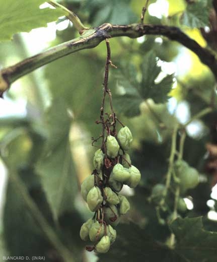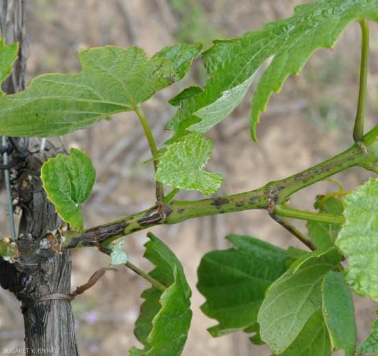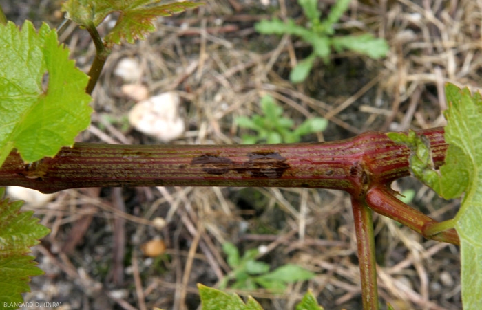 Le lesioni compaiono sui primi internodi alla base dei giovani germogli, spesso a livello delle lenticelle. Sono di taglia contenuta, di forma allungata, e inizialmente di colore scuro (figura 1); diventano marroni e nere mostrando successivamente riflessi bluastri (Figura 2). Queste lesioni necrotiche diventano frequentemente cancelleria, i tessuti centrali della corteccia si assottigliano e si screpolano più o meno in larghezza (Figure 3-7). Quest'ultimo fenomeno si amplifica durante un periodo di rapida crescita della vite. Simili lesioni si possono osservare sui piccioli e sui peduncoli di infiorescenze e racemi. Questi possono portare al deperimento del grappolo, che poi non viene più nutrito, o debolmente (figura 8).