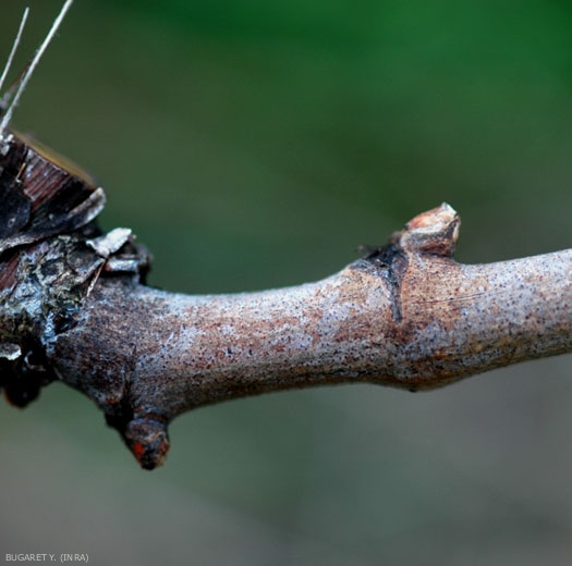 Con l'invecchiamento dei tessuti, le lesioni curative diventano sempre più corrose. Una volta induriti i germogli, in autunno si osservano sbiancamenti del legno oltre a lesioni necrotiche (Figura 10). Inoltre molte gemme sono state o sono invase dal micelio del fungo, si tratta di gemme morenti che non emergeranno la primavera successiva.