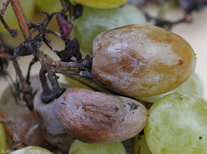 Anche gli acini d'uva sono colpiti; diventano gradualmente marroni e avvizziscono (Figura 12).