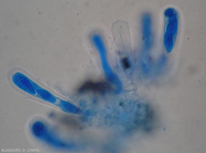 • La forma imperfetta produce picnidi sferici (59-196 µm di diametro), solitari, sporgenti, neri, aperti da un ostiolo (figure da 5 a 9) da cui le a fuoriusciranno picniospore maturità (figure 10 e 11). Queste picniospore sono incolori, ovoidali (4,5-9,3 x 4,5-5 µm) inglobate in un cordone mucillaginoso (cirro) di colore biancastro (figura 7).