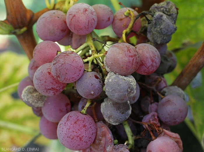 Una volta che il tubo germinale è stato avviato, penetra nei tessuti e dà origine al micelio che distrugge le pareti delle cellule e il loro contenuto. La penetrazione avviene direttamente attraverso la cuticola e l'epidermide, o da varie ferite. Aggiungiamo che può penetrare nelle bacche tramite microfratture che si formano attorno agli stomi non funzionali. Sarebbe in grado di avviare contaminazioni latenti a seguito di contaminazioni ovariche attraverso gli stimmi e gli stili alla fine della fioritura. Le infezioni avvengono indicativamente dopo circa 15 ore in presenza di umidità e temperature ottimali comprese tra 15 e 20°C. La Botrytis cinerea , una volta in sede, invade i tessuti sani (figura 3) o più in particolare tutti i tessuti senescenti, necrotici e/o morti come petali, sepali necrotici, vecchie foglioline, acini abortiti Capita di colonizzare tessuti già danneggiati da altri patogeni, da parassiti (Eudemis, cochylis) o dalla grandine. Si diffonde rapidamente ai tessuti che fa marcire in pochi giorni, grazie all'idrolisi delle sostanze peptiche.
