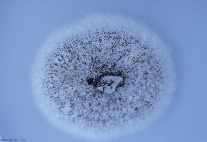 - Aspetto delle colonie su terreno agar-malto : quelle di A. niger hanno una crescita relativamente rapida. Le ife settate e ialine di Aspergillus conferiscono inizialmente alle colonie un aspetto bianco cotonoso; questi si scuriscono e diventano neri o addirittura polverosi con produzione di spore nere (figura 5). Il dorso della colonia, dal canto suo, assume una colorazione bianco-gialla.