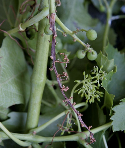 Sintomi : durante l'invaiatura compaiono lesioni necrotiche marrone scuro sul fusto, spesso ben delimitate ai rami. Il raspo e gli acini alla fine appassiscono e si seccano.