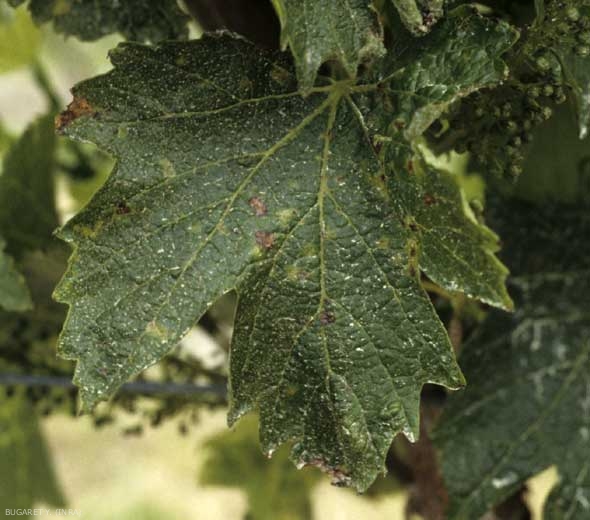 - Se X. ampelinus ha uno sviluppo epifitico (sulla superficie delle foglie inferiori dei germogli), questo batterio, penetrando attraverso gli stomi e colonizzando il parenchima, provoca piccole macchie oleose angolari, da 1 a 3 mm di diametro, di colore bruno tinta scura a termine, e circondata da un alone clorotico più o meno marcato (figure 1 e 2). Si noti che quando gli attacchi avvengono su foglie giovani, queste in presenza di macchie possono essere più o meno deformate (figura 3).