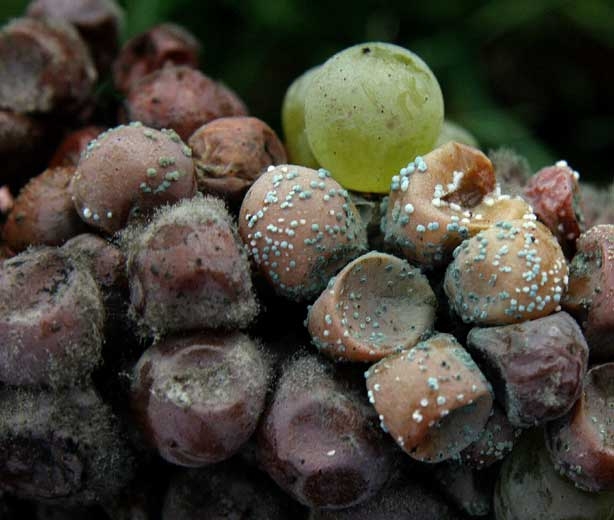 Questi acini mostrano sia marciume grigio (<b> <i> Botrytis cinerea </i> </b>) sia marciume blu (<b> <i> Penicillium expansum </i> </b>).