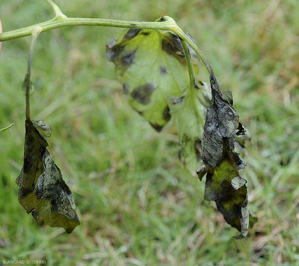 Détail des taches humides et noirâtres présentes à la face supérieure d'une foliole de tomate. <b><i>Didymella lycopercisi</i></b> (taches à <i>Didymella</i>, <i>Didymella</i> leaf spot)