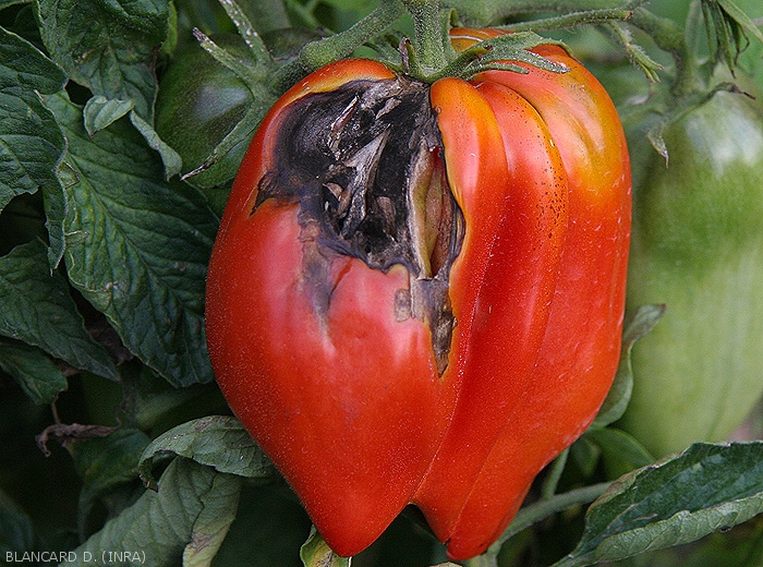Una <b><i>Alternaria</i> sp.</b> opportunistica si è posata sulla punta di un frutto di pomodoro maturo.  I tessuti marci si sgretolano e un velluto nero li ricopre.