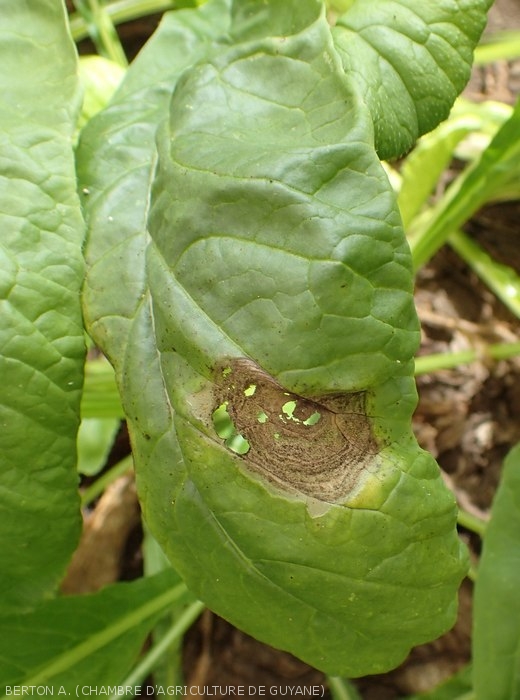 Sur cette lésion sur cette feuille de chou, on distingue mieux les discrets motifs concentriques présents sur les tissus nécrosés. <i>Alternaria brassicicola</i> (alternariose)