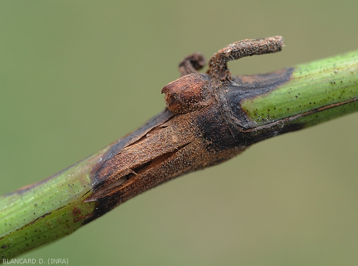 - Le lesioni sui pedicelli e sui rametti sono più o meno allungate e depresse, di colore brunastro; i tessuti colpiti alla periferia sono di colore da marrone scuro a nerastro (Figure da 10 a 17). Le alterazioni possono essere anche cancerose, circondate da fasce di tessuto cicatriziale che provocano la rottura della corteccia in strisce piuttosto caratteristiche (figure 10, 11, 15 e 16). Si noti che le alterazioni sui germogli verdi sono localizzate attorno ai nodi (figure 12, 13 e 16).