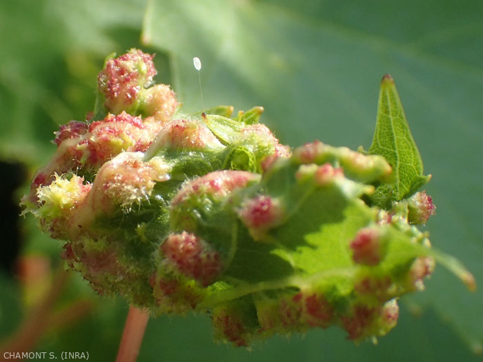 In Francia esistono diverse decine di specie di Chrysopidae, alcune delle quali sono state descritte in vigna ( Chrysopa perla, Chysoperla carnea, C. lucasina, C. affinis, Pseudomallada prasinus , ecc.). Gli imago o adulti sono di taglia variabile (tra 18 e 53 mm), spesso di colore verde, a volte marrone o scuro. Gli occhi sono emisferici e molto prominenti, le antenne sono filiformi e lunghe. Le ali sono trasparenti con venature vistose, prive di ornamenti. Questi adulti si nutrono principalmente di polline e nettare (figura 1), ma anche di melata (afidi, cocciniglie) e la loro presenza è legata all'ambiente floristico del vigneto.