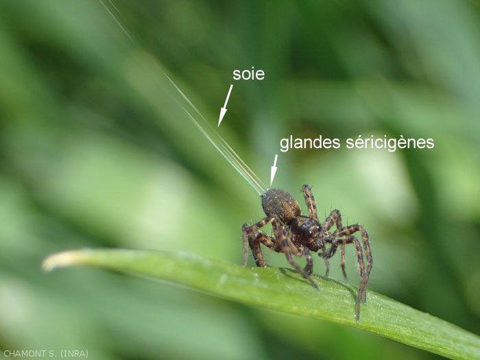 La seconda parte del corpo è l'addome o opistosoma. Le ghiandole sericogene situate sull'addome producono la seta (foto 3), una proteina che si solidifica nell'aria ed è costituita da microfibrille e che permette di formare veli o di avvolgerle direttamente. La seta viene utilizzata anche per la formazione di nidi a protezione delle uova (foto 4).