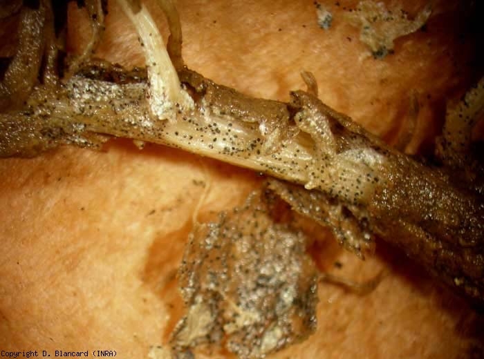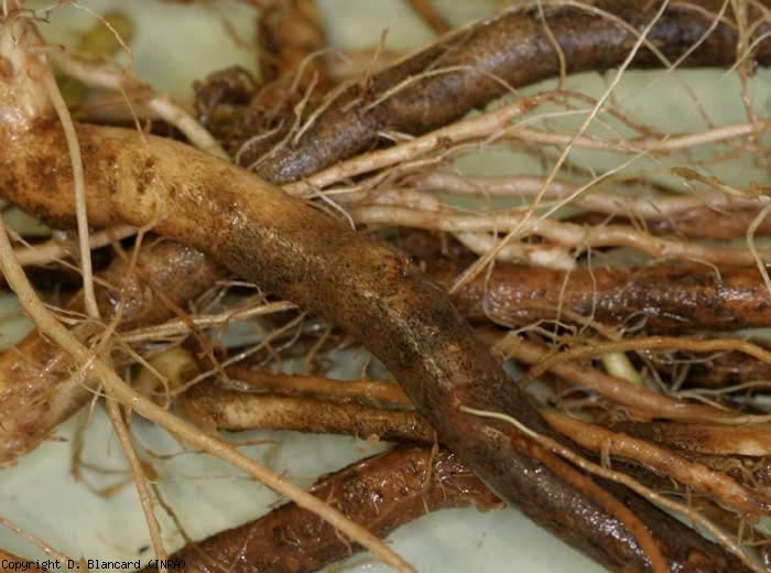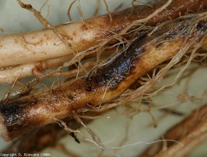 Sulle radici , questo fungo è responsabile in particolare di lesioni brune . Le radichette sono poche o inesistenti perché un marciume corticale bruno le ha distrutte. La corteccia delle radici principali mostra lesioni marrone scuro, più o meno suberizzate (Figure da 4 a 6). Occasionalmente è stata segnalata la putrefazione della base dello stelo. La corteccia scomposta è staccata in alcuni punti dal cilindro centrale. Nelle colture fuori suolo, le radici attaccate sono poco sviluppate, scolorite e parzialmente decomposte (Figura 7). A marciume radicale e l' avvizzimento delle foglie questo fungo sono attribuiti anche il .