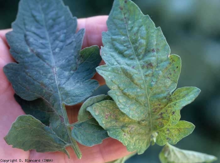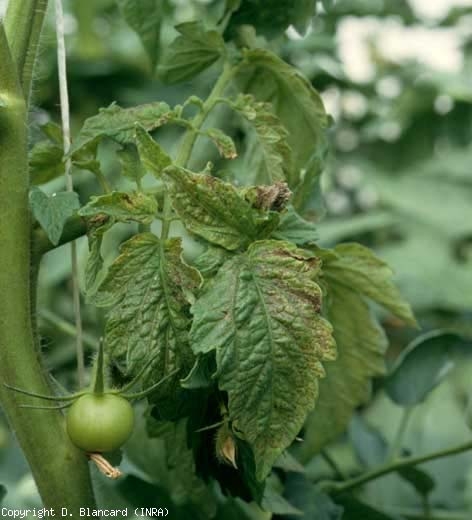 Successivamente le zone colpite si diffondono e le foglioline, piuttosto clorotiche, assumono una tinta abbronzata che è all'origine del nome "malattia del pomodoro bronzato" (figura 7). Lo stesso vale per le macchie necrotiche che si uniscono e causano necrosi e disseccamento di interi volantini. Di lesioni necrotiche (striature) possono comparire sui piccioli e sugli steli . Dopo diverse settimane, i piedi malati possono essere completamente necrotici. A volte si osserva avvizzimento.