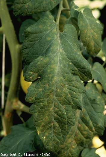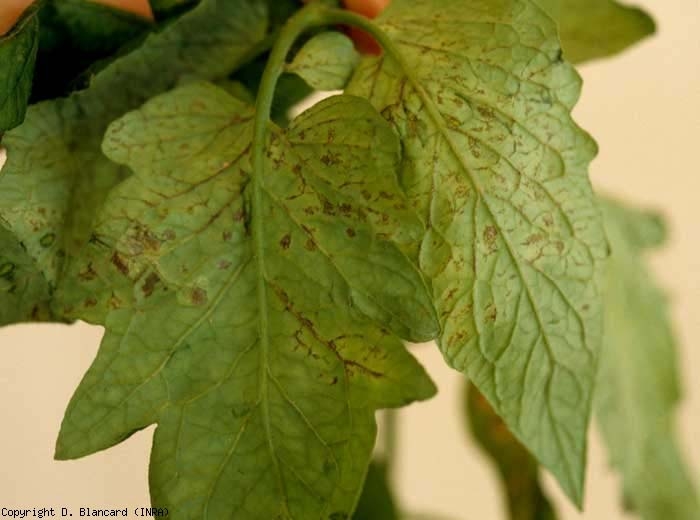 l' appassimento di essiccazione , e la necrosi foglia . Pertanto, i volantini delle piante di pomodoro colpite possono presentare:- chiazze internervali livide sulle foglie inferiori, che si estendono, necrotizzano e si disseccano gradualmente;- necrosi e disseccamento della periferia del lembo di foglie giovani e vecchie;- appassimento e disseccamento delle foglie dell'apice .