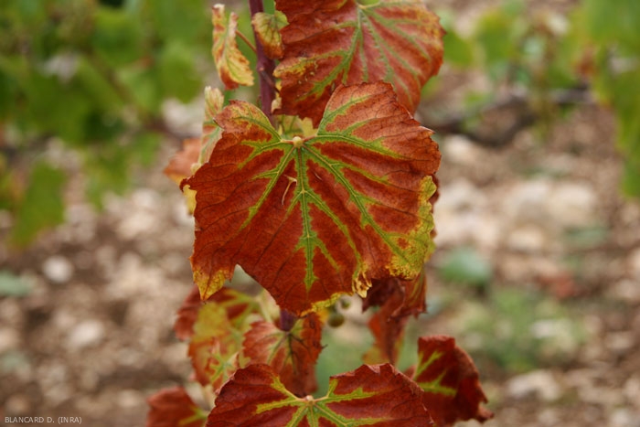 - una forma lenta caratterizzata da un progressivo deperimento della pianta che sminuisce e presenta gemme che abortiscono. Gli internodi sono più corti, le foglie più piccole ma generalmente non distorte. A volte, in piena estate ea seconda delle condizioni climatiche, le foglie dei vitigni a bacca bianca ingialliscono e quelle dei vitigni a bacca nera si arrossano, questo prima della defogliazione prematura (figure da 7 a 10);