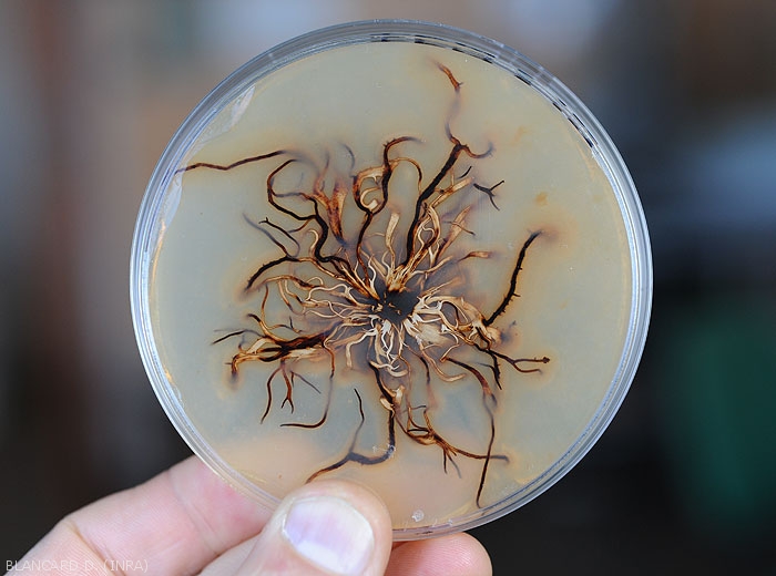 - Aspetto sul terreno di coltura : In si osserva una certa diversità morfologica vitro (FIG. 4). La maggior parte dei ceppi di A. mellea produce rizomorfi (Figura 5). Le colonie hanno un aspetto crostoso, un colore marrone mogano e un aspetto lucido. Il micelio è solitamente aereo ai margini della colonia o distribuito irregolarmente. Nella parte inferiore della coltura, possiamo vedere anelli neri corrispondenti alla formazione di " linee nere ".