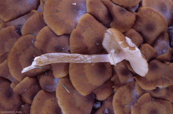 * Da notare che alla fine degli anni '70 la specie , A. mellea che allora raggruppava tutti i funghi responsabili del marciume radicale su varie specie legnose, era suddivisa in diverse specie diverse, di cui 5 per l'Europa. Queste specie differiscono in particolare per la gamma di ospiti e le esigenze ecologiche. Il nome di A. mellea fu mantenuto per l'armillare asservito alle latifoglie, compresa la vite. Armillaria ostoyae , che attacca le conifere, non si vede mai sulle viti. Questo spiega le osservazioni fatte dagli antichi che osservavano che le piantagioni di vite nelle radure di conifere erano meno attaccate di quelle fatte nelle radure di latifoglie.