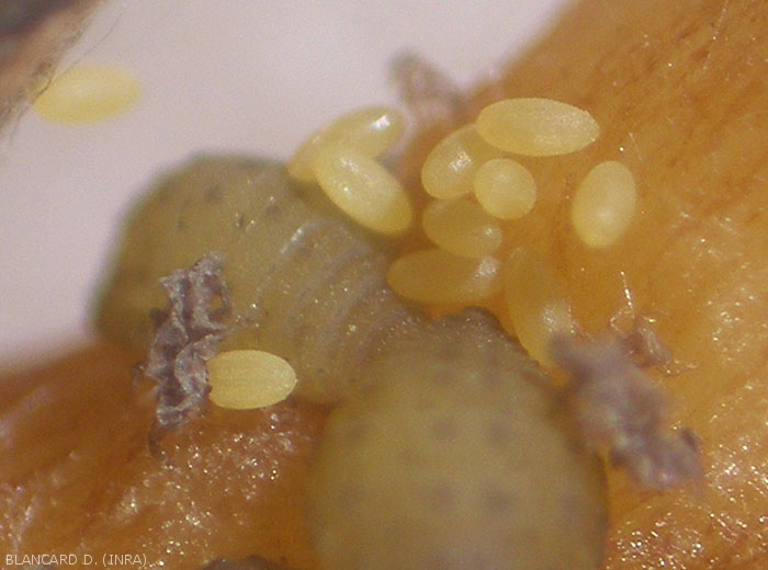 Le larve (figura 2) sono piriformi e di colore giallo-verde, tranne le larve svernanti che sono più scure. La loro dimensione varia a seconda dello stadio di sviluppo; possono raggiungere 1,2 mm di lunghezza. Le larve neonate di radicole si muovono solo per una breve distanza a seconda della concentrazione di argilla.