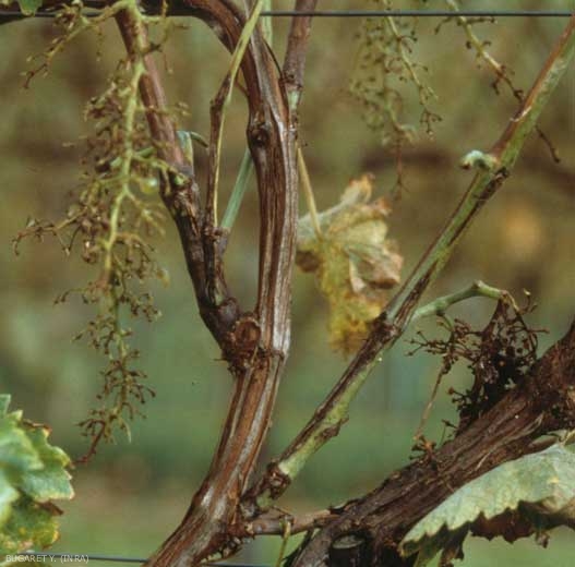 Lesioni oleose longitudinali, da brune a nere, più o meno cancerose a termine, esplosioni, screpolature si osservano sui peduncoli e sul picciolo dei grappoli, sui rametti (figure da 5 a 8) e sui rami.