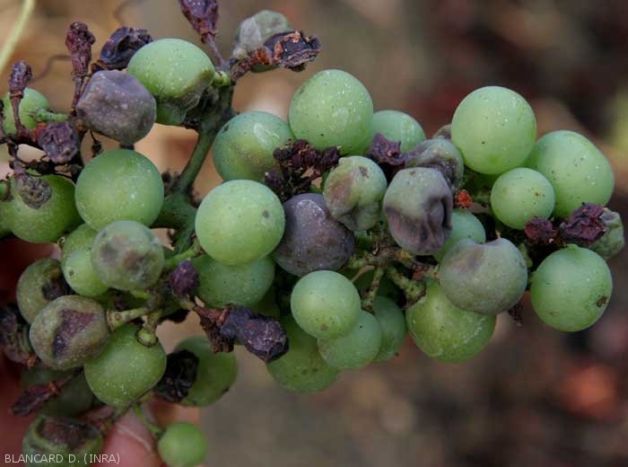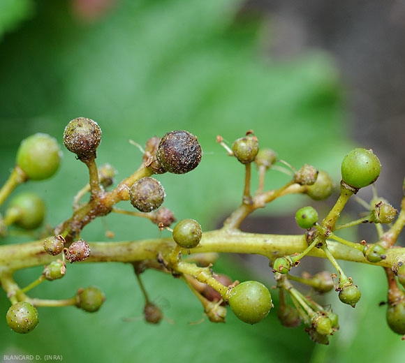 Su alcuni acini si possono osservare macchie da brune a nerastre, depresse in spinta.  Alcuni di loro sono più o meno avvizziti.  <b> <i> Plasmopara viticola </i> </b> (Peronospora, "<b> marciume bruno </b>")
