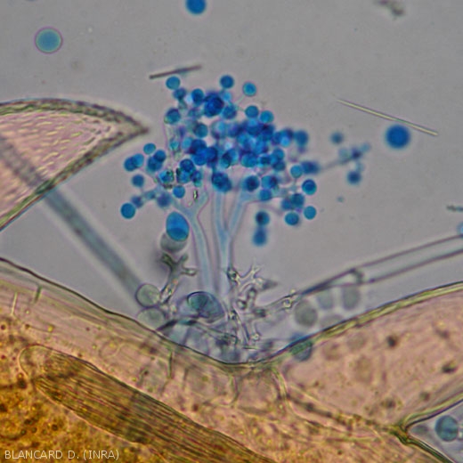 Su questa foglia che ha svernato al suolo, osserviamo la presenza di un filamento germinale portante all'estremità un macroconidi all'origine dell'inoculo primario. <b> <i> Plasmopara viticola </ i > </b>