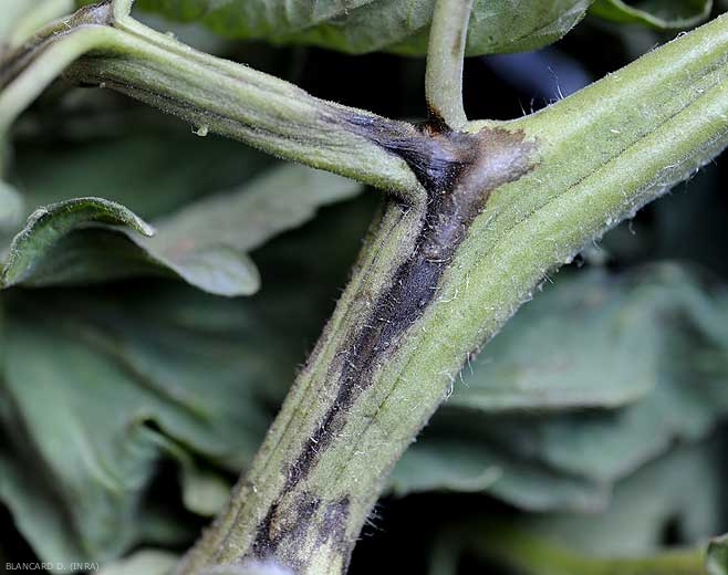 Brunimento longitudinale sulla colonna vertebrale di una foglia di pomodoro. <i><b>Pseudomonas corrugata</b></i> (mozzo nero, tomato pith necrosis)