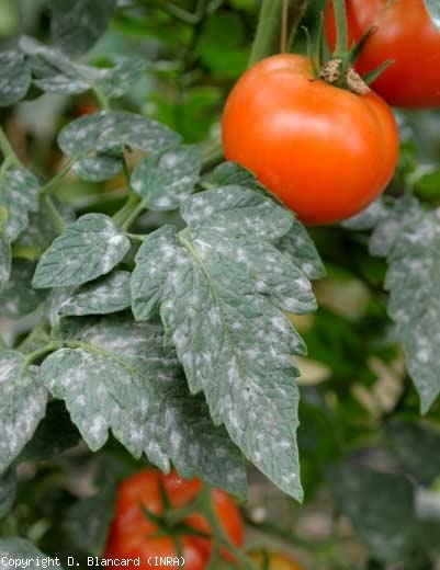 Anche in questo caso, lo sviluppo dell'oidio sul limbo porta alla comparsa di lesioni necrotiche brunastre sotto le colonie micelie. <i><b>Oidio neolycopersici</b></i> (oidio, downy mildew)