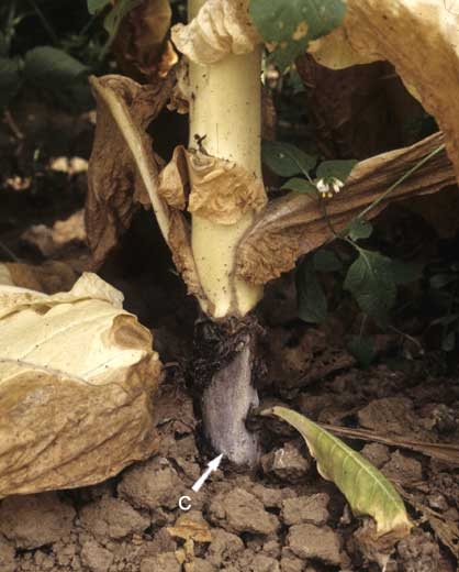 - muitos fungos, como Botrytis cinerea, Calonectria crotalariae (syn. Cylindrocladium crotalariae) Diaporthe ziziphina, Fusarium oxysporum f. nicotianae, Haematonectria haematococca (antigo Fusarium solani), Helicobasidium monpa, Macrophomina phaseolina, Phytophthora nicotianae, Pythium spp. (figura 1), Rhizoctonia solani, Sclerotinia sclerotiorum, Athelia rolfsii (ex-Scleiumrot rolfsii), Thielopsis basicola (s. Chalara elegans, figuras 2 e 3) e Verticillium dahliae;