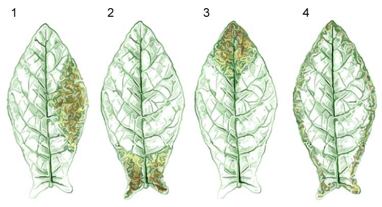 - Mosaicos das folhas (padrões de mosaico e sintomas relacionados) (Figura 1);
