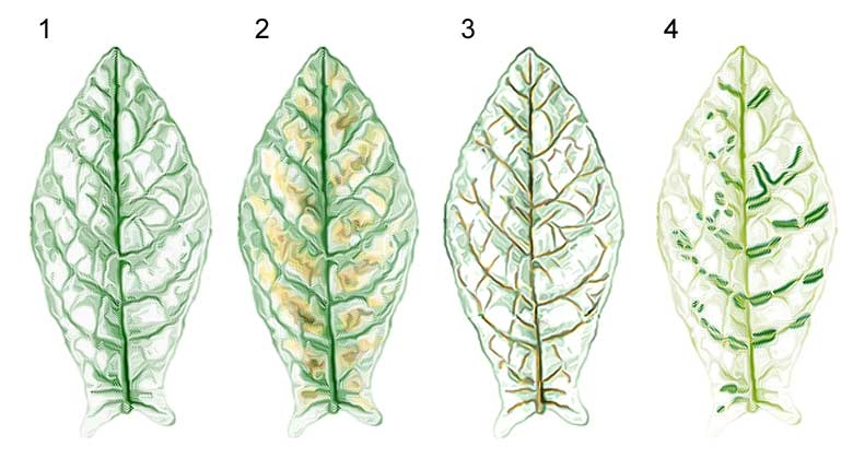 Diferentes descolorações das folhas são descritas nesta seção e ilustradas pelas fotos abaixo: