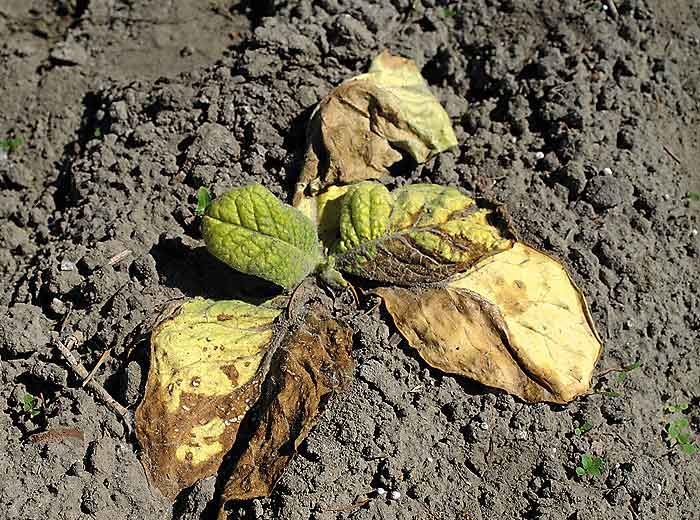 As lesões alongadas de marrom a preto são observadas nas veias, pecíolos e caules (figura 4). O topo da planta, por vezes, se inclina para o chão (figura 5).