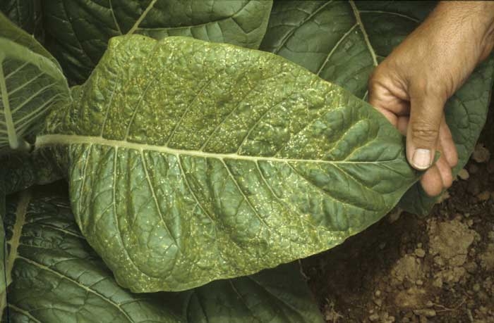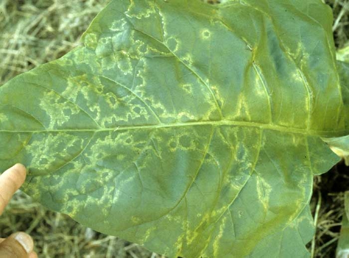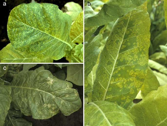 - existem padrões discretos em forma de vírgula, branco para bege, entre ou perto das veias ("etch"), devido ao TEV (figura 3) e PVY; esses padrões ocorrem também em genótipos resistentes a nematoides de galha de raiz, e ao CMV.