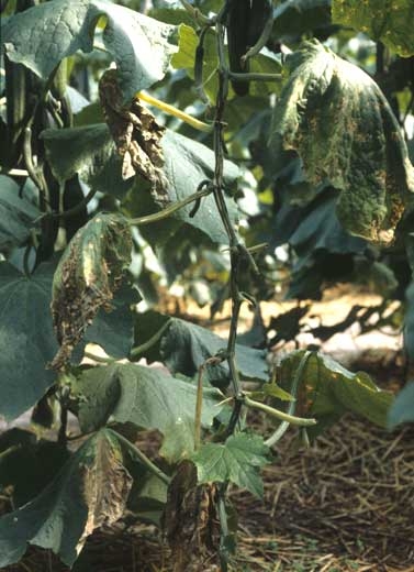 Manchas necróticas marrons aparecem próximas às veias e podem se fundir. Ocasionalmente, mudas jovens morrem. Em plantas maduras, os sintomas estão localizados principalmente nas folhas inferiores.