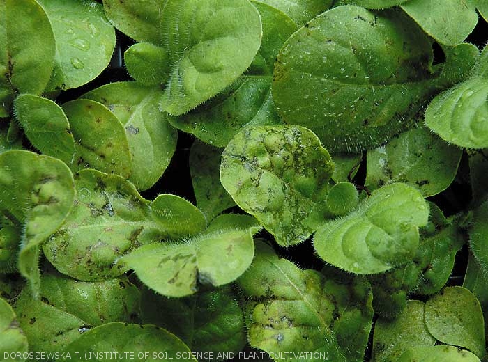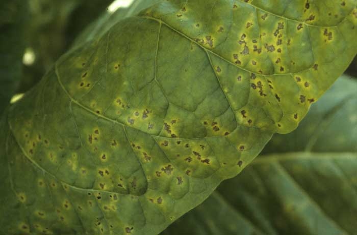 Pseudomonas syringae pv. tabaci causa principalmente manchas foliares em canteiros e em plantas adultas no campo. As manchas são inicialmente pequenas e gordurosas (figuras 1 a 3). Mais tarde, tornam-se necróticas e rapidamente tornam-se castanhas (figuras 4 a 9).