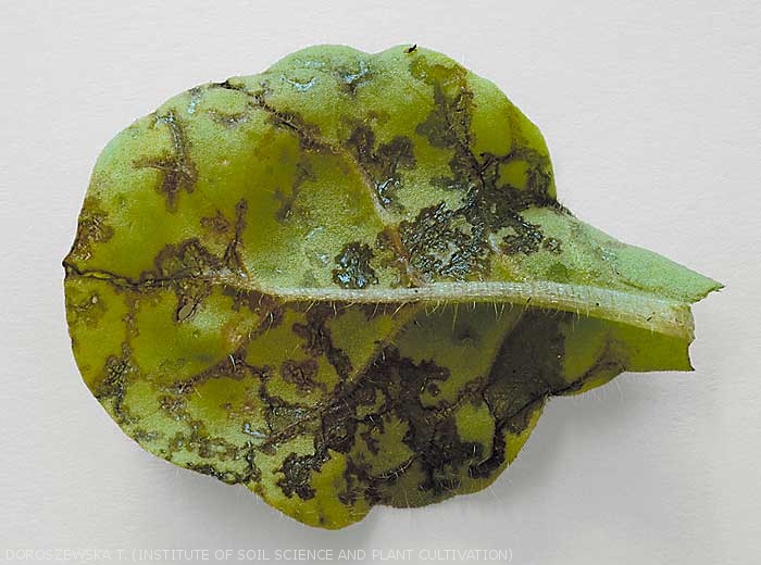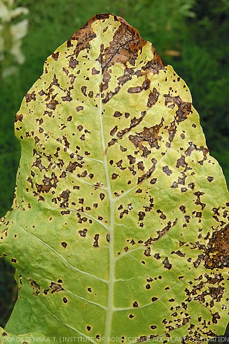 As lesões podem converger na lâmina (Figura 10), em tecidos alterados podres e caídos (Figura 11). Com as estirpes produtoras de tabotoxina, as manchas estão rodeadas por um halo amarelo mais ou menos marcado (figura 12).