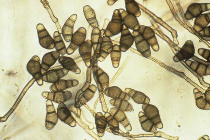 Em condições favoráveis pode-se observar seus conidioforos longos e hialinos, com conidios de parede pluricelular espessas, com uma lente de mão ou um microscópio.